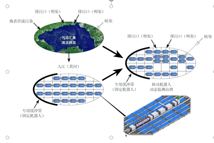 針對上述難題,項目組于2017年開始致力于湖庫污染修復(fù)裝備及技術(shù)工藝的開發(fā),歷時5年聯(lián)合攻關(guān),在“智慧環(huán)保 、專用裝備、創(chuàng)新工藝、長效機制”四個方面獲得突破,并取得多項原研類創(chuàng)新成果。其中,原研發(fā)明并投產(chǎn)了“自發(fā)現(xiàn)、監(jiān)測、尋污、治理機器人”“微生態(tài)自循環(huán)富氧緩沖帶”等多項大型關(guān)鍵裝備;依此構(gòu)建了自然湖庫污染整體管控的多維模型;填補了自然水體關(guān)鍵污染因子治理的技術(shù)性空白;在國內(nèi)外首先實現(xiàn)并建立起水生態(tài)智慧持續(xù)化修復(fù)的長效機制。