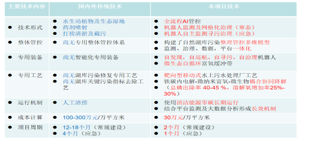 與傳統(tǒng)水體綜合治理的方式相比較,該成果在技術(shù)形式、整體管控、專用裝備、專用工藝、運行機制、成本運行、項目周期上獲得全方位突破。綜合成本僅相當(dāng)于傳統(tǒng)技術(shù)的七分之一以下,項目周期平均縮短百分之六十以上。具有極高的產(chǎn)業(yè)應(yīng)用的前景。